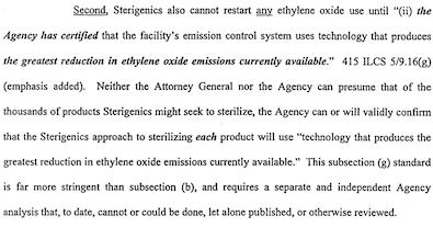 Can someone clarify — the new law says in what Rich clipped above that as a condition of Sterigenics reopening to sterilize a product, the Agency (not the company) has to certify first that Sterigenics is has implemented technology that leads to the greatest ethylene oxide reductions currently available. How can you get more stringent or restrictive than that in a consent order, apart from an outright ban on all ethylene oxide sterilization, which the consent order doesn’t do either?