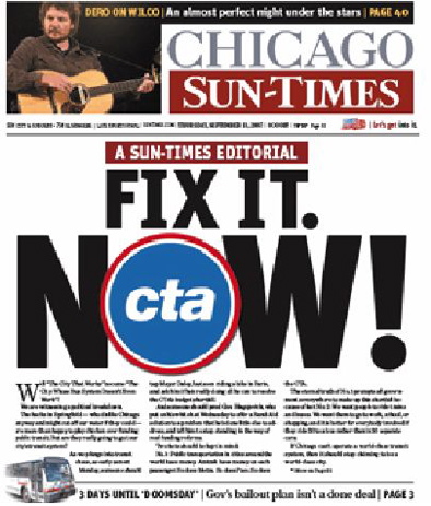 * The Sun-Times ran a front-page editorial today expressing its disgust over the transit mess. The paper made an important point about Mayor Daley, who’s traveling yet again in Europe when he should be here involved in a solution…