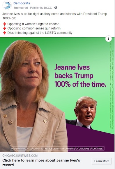 The DCCC ad is taking a cue from the Democratic Governors Association playbook. Before the March 2018 Illinois primary, the DGA ran an ad highlighting Ives’ conservative credentials in an attempt to defeat Rauner, who won with 51 percent of the vote.