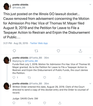 We’re very pleased that Judge Jack Davis did the right thing and threw out this completely frivolous ‘political stump speech’ of a lawsuit. Now that it is clear that Illinois Policy Institute CEO John Tillman and the Warlander hedge fund filed this phony lawsuit just to try to sabotage Illinois’ credit rating for personal financial gain and headlines, anyone who has supported the IPI in the past should rethink their support. Under the new leadership of Governor Pritzker and the steady resolve and financial stewardship of the Comptroller’s Office, the state of Illinois is fixing its finances and the bond rating agencies are recognizing this.