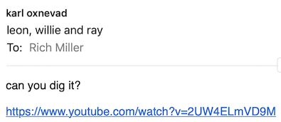 * Wordslinger regularly sent me late-night emails with YouTube links to songs he loved and which he figured I’d love, too. Here’s his last such email to me…