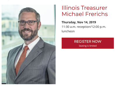 The ageless and priceless Jay Doherty, booking master, extraordinaire, will have the Treasurer of the State of Illinois Mike Frerichs speaking at the City Club of Chicago tomorrow.