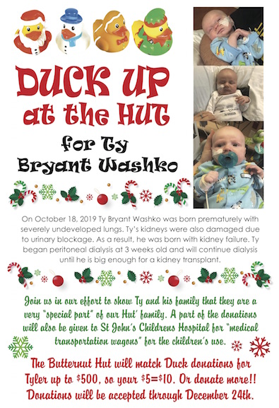 Every year we raise $$ for a needy infant and St. John’s Children’s Hospital for kids’ medical wagons. We’ve always used the theme “Duck up at the Hut”….. selling rubber ducks that customers buy and hang from the ceiling.