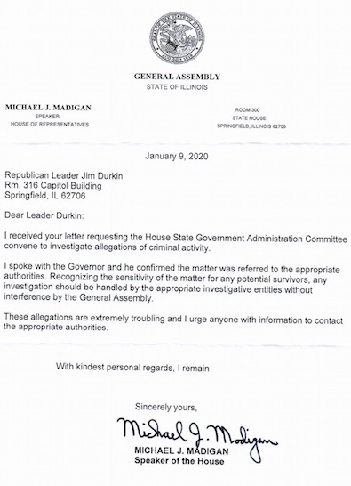 Speaker Madigan’s response (see attached) to reject our call for an investigation into alleged claims of rape and ghost payrolling made by Mike McClain is disappointing but not surprising.