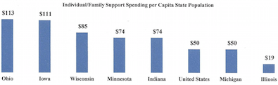 For every resident of Illinois (and in other states), this is the amount of resources invested in individual and family support services for people with disabilities. For each resident of Iowa (not with a disability, but in the general population) the state spends $111 on individual/family support services as defined below the graph; in Illinois, we spend $19. It’s not a budgetary formula, but an after-the-fact comparison that allows comparison of states with different populations.