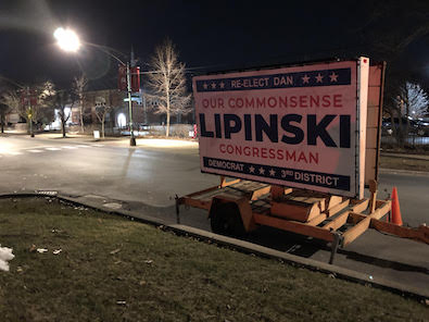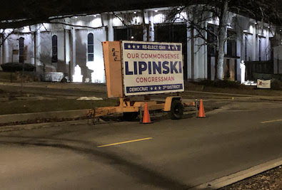 Which? The Lipinski sign taking up nearly a full lane of the street, or the stop sign posted on the street to give advantage to the church parking lot entrance?