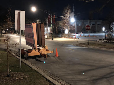 These pictures are from yesterday [Saturday] evening. This construction warning sign has two vinyl banners - one on each side - affixed to metal poles via some plastic cable ties. Note the cones around the trailer. This was sitting at the corner of 101st and Longwood on the easternmost border of Lipinski’s district, across from St. Barnabas Church in the 19th Ward. It showed up there yesterday afternoon, right before services, and was gone this afternoon.