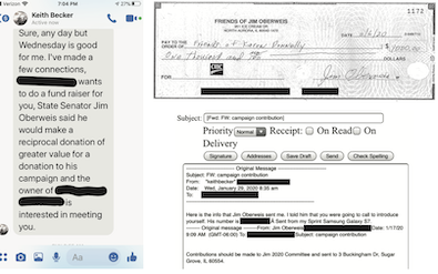 Until, at the beginning of February, Jim Oberweis had an agent of his campaign, Keith Becker, contact LaSalle County State’s Attorney Karen Donnelly via Facebook message saying: “State Senator Jim Oberweis said he would make a reciprocal donation of greater value for a donation to his campaign.” Becker then followed up with an email to State’s Attorney Donnelly with Jim Oberweis’ personal cell phone number letting her know that Oberweis was expecting her call.