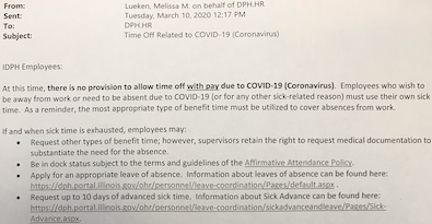 * Employee memo today from the Illinois Department of Public Health, which is overseeing the state’s COVID-19 response. Click the pic for a larger image…