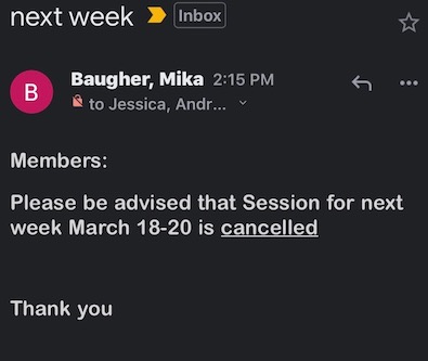 The GA was scheduled to come back for three weeks and then take two weeks off for spring break. They ought to just cancel everything until May, do a budget and some cleanup legislation on cannabis and infrastructure and whatever else and get outta town.