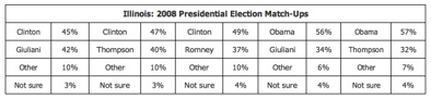 And I don’t know why anyone would object to reviewing bad and worsening poll numbers. Personally, I’m wondering how much the IL Clinton/Guiliani spread would widen to approach the Obama/Giuliani spread should both of the former be nominated.