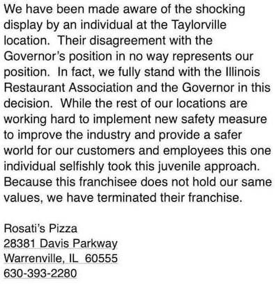 Rosati’s of Taylorville, the defiant pizza restaurant that posted a huge window sign that said “Gov. Pritzker — Screw You” after the governor announced a statewide restaurant shutdown, has lost its franchise with the Rosati’s chain.