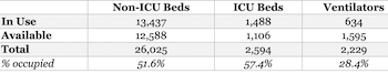 As of March 23, data reported to the Illinois Department of Public Health (IDPH) showed 12,588 non-ICU beds, 1,106 ICU beds and 1,595 ventilators available in hospitals across the state. The current capacity of the state’s health care system as of is shown in the table below.
