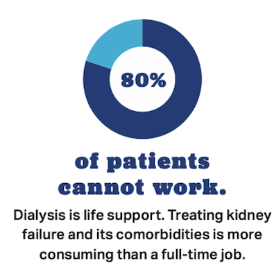 In fact, about 80% of dialysis patients cannot work. To learn more, follow us on Twitter, like us on Facebook, and visit our website.