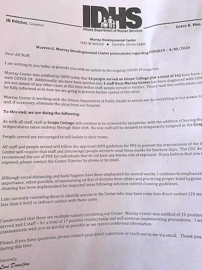 My daughter lives at Murray Center in Centralia, and I cannot say enough good things about the administration and staff at Murray Center. They have done every thing right in helping keep our loved ones safe. No one has been on the grounds except staff and delivery trucks since March 12th. All things coming in the center are sanitized before they go to cottages. All staff have temperatures taken before they are able to go on any cottage. Residents have their temperatures taken numerous times throughout the day. The individual who tested first had a slight temperature for a few hours. He was immediately tested, and when he came back positive the rest of the individuals on his unit were tested. NONE HAD ANY SYMPTOMS and still don’t. They all tested positive. This is a very scary virus. You can have it and have no symptoms and be spreading it. The Murray families have received updates EVERY day from the Administration, which are forwarded by our parents group director. We cannot say enough good things about our staff. We know our loved ones are in the best place possible. THANK YOU STAFF!