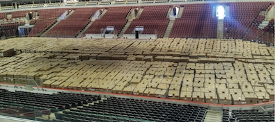 Instead of an ice rink or basketball court, the floor of the United Center is currently packed from end to end with nearly 26,000 boxes of food.