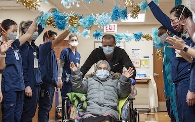 * Caption: Hospital workers at Advocate Illinois Masonic Medical Center in Chicago, Illinois cheer for Carmen Benabe, 86, as she’s released after four days of treatment for COVID-19…