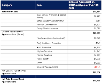 As shown in Figure 1, of the $40.8 billion in total General Fund spending budgeted for FY 2020, $13.6 billion is for “Hard Costs” or mandatory spending obligations over which decision makers have no discretion, because they are required to be paid either by law or contract. Once those Hard Costs are paid — as they have to be — that leaves only $27.01 billion appropriated for services.