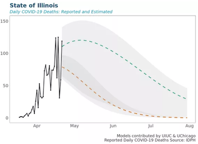 I want to look first at the projected fatalities. As you can see from the graphs that are next to me, Illinois is now looking at a peak, or plateau of deaths per day. Somewhere between late April and early May.