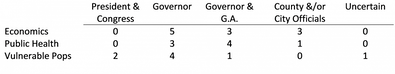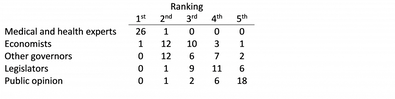 4) How would you rank the following sources of advice the governor might take into account in making decisions about when, where, and how to adjust emergency orders? Please drag and drop the boxes so that they are in order from most to least important.