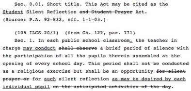 HB 4180 changes the title of the law from the “Silent Reflection and Student Prayer Act” to the “Student Silent Reflection Act.” It allows, rather than mandates, a teacher to conduct a brief period of silence at the opening of every school day. It removes language about “silent prayer” and leaves it up to individual pupils. Here’s the actual language striking out the old stuff and inserting the new…