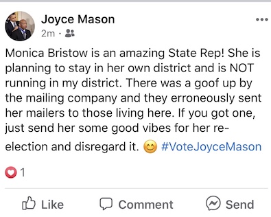 * Rep. Joyce Mason is a Gurnee Democrat. Rep. Monica Bristow is an Alton Democrat. Somehow, some wires got crossed…