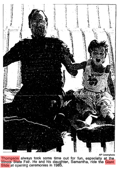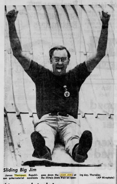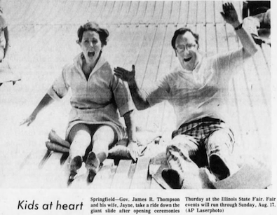 * Gov. Jim Thompson went down the giant slide to open the Illinois State Fair every year. Here are a few photos that my pal John Amdor found online when I came up empty…