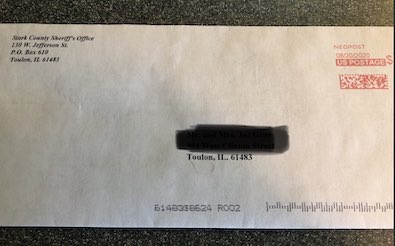 * A reader today sent me this mailer she recently received from her county sheriff. The return address is the same as the Stark County Sheriff’s office in Toulon. The email the sheriff uses in the letter matches the one on his official website and he admits below that this is official stationery…