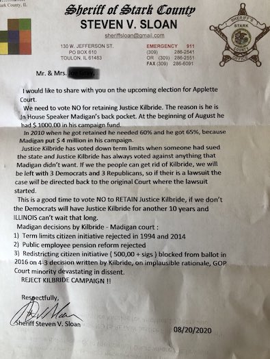 1) Applette? Aside from the multiple typos in the letter, Justice Thomas Kilbride is running for retention on the Illinois Supreme Court. The Illinois Republican Party has made defeating Kilbride a top priority this year.