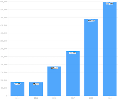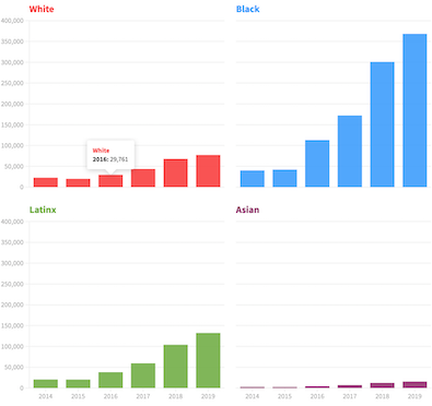 2014 appears to have a ~2x difference with 2019 at 4.4x. The increases in stops since 2016 was disproportionate among one groups even though they increased across all.