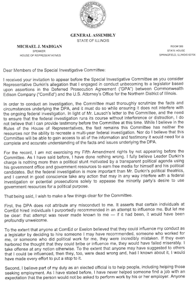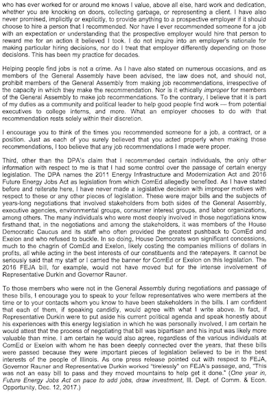 On first reading, I gotta say it sounds pretty reasonable. How this holds up will depend on the testimony of others. Will anyone say they acted on his orders or with his knowledge? If no former staffers do, and Exelon doesn’t allege any specific conversations or requests for bribes by him, then this seems to grind to a halt pending the federal investigation. Hope Durkin is ready for questions about his role, too. Maybe he will change his mind about appearing?