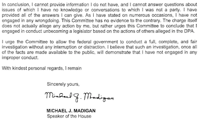 === “…The charge itself does not actually allege any action by me, but rather urges this Committee to conclude that I engaged in conduct unbecoming of a legislator based on the actions of others alleged in the DPA…”===