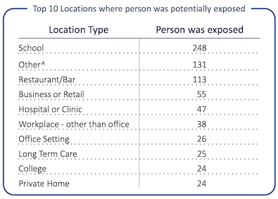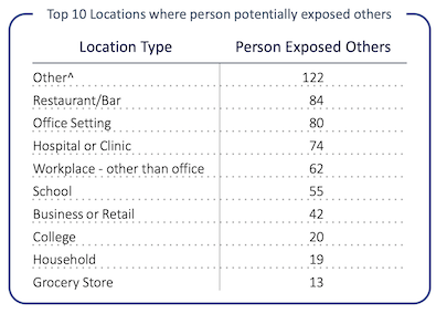 ‘Other’ means locations not selected from the 37 standard locations available to the contact tracing workers. These locations include vacation, frat house, library, fire department and a variety of other venues and may include non- responses.