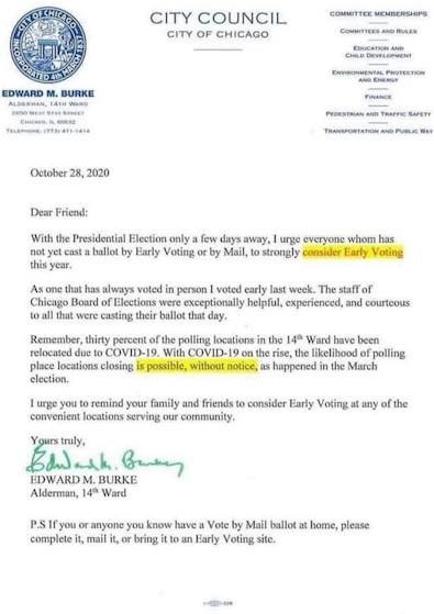 The concern was prompted when embattled Chicago Ald. Ed Burke, 14th Ward, sent a letter to constituents urging early voting to avoid sudden Election Day closures.