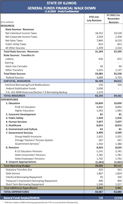 My Chief of Staff Anne Caprara will be reaching out to your respective offices to identify an agreeable date and time next week to convene this meeting which I hope could take place as soon as possible. While all of us have been asked about both potential cuts and revenue options in the wake of the defeat of the fair tax amendment and the impact the pandemic has had on our state’s revenues, I would suggest that the agenda for our first meeting focus on coming to an agreement on the size and scope of the deficit we face in the current fiscal year. For your review, I have enclosed a copy of the FY21 budget summary reflecting GOMB’s accounting and estimate of revenues and expenditures associated with the General Funds as of the date of this communication.