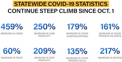 Per IDPH statistics (https://www.dph.illinois.gov/covid19/covid19-statistics), there were 295,440 positive test results/confirmed cases on 10/1 and 536,542 as of today. That doesn’t work out to +250% or +209%, let alone 459%. Where are the numbers to support the Powerpoint slide?