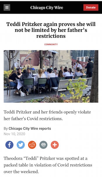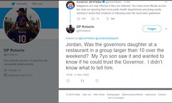 at a restaurant in Chicago seated outside in a large group of people for a birthday party. Only problem is that’s not the Governor’s daughter (and doesn’t even look like her.)I dutifully clarified this for people sending me the picture but, like clockwork, it soon made its way to the army of Twitter trolls invested in combatting the Governor’s Covid mitigations. Kicked off with tweets like this…