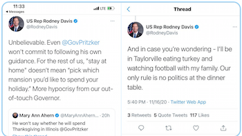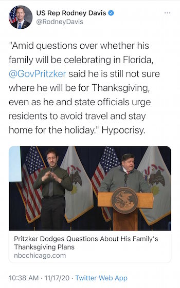 Has anyone asked Rodney Davis where his Dad is spending Thanksgiving? His home in Springfield or Taylorville? He’s really the last person to be judging anyone. I’m sure these people will be given there 15 minutes of fame on the morning Bishop show.