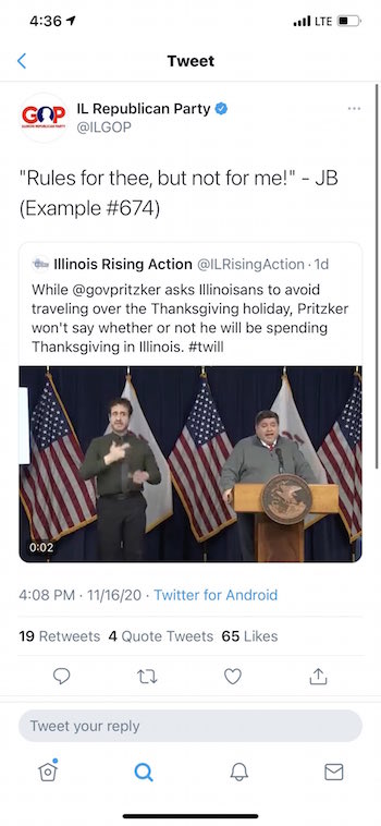 Notice also how supposedly responsible office holders jump to spread the innuendo - and will do nothing to correct the spread of lies when they are called out. Notice how we went from a fake picture to “GOVERNOR PRITZKER IS BREAKING THE RULES!!”