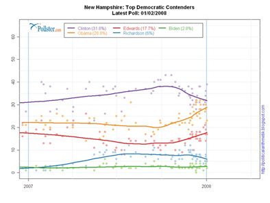 You can click it for a larger image and more explanation, but you can easily see that while Clinton is ahead, her numbers are obviously trending downward and Obama’s are sharply rising. New Hampshire’s primary is next Tuesday, so it’s gonna be very, very tough for Clinton to stop Obama’s momentum before then. He’ll have several days of euphoric bounce which may last all five days. A negative attack from Clinton now would likely backfire, unless Obama does something bad to himself.