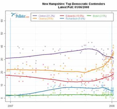 * Meanwhile, the latest aggregate polling data from Pollster.com shows Obama with a large lead over Clinton in New Hampshire. Note the spike…