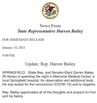 * Rep. Darren Bailey (R-Xenia) appears to have had some sort of medical emergency. Live video from BlueRoomStream.com showed Bailey lying on his back on the floor for several minutes. He eventually stood up and was placed in a gurnee by paramedics and wheeled out of the House chambers at the BOS Center.