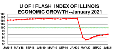“The availability of various vaccines has yet to have a significant impact on the spread of the virus,” said University of Illinois economist J. Fred Giertz, who compiles the monthly index for the University of Illinois System’s Institute of Government and Public Affairs (IGPA). “However, many observers believe the economy is on the cusp of a major resurgence resulting from the eventual effectiveness of the vaccine program along with strong pent-up demand in the economy.”