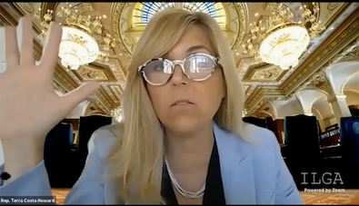 * I was watching the House Adoption & Child Welfare Committee hearing on Monday and couldn’t help but notice the cool Zoom background used by Rep. Terra Costa Howard (D-Glen Ellyn). She told me she obtained the image from the House Democrats, which is not what I expected to hear considering the HDems’ past issues with newfangled things like the Internet and touch-tone phones. “It’s a little more engaging than my white wall,” the legislator said. Here’s a screen shot…