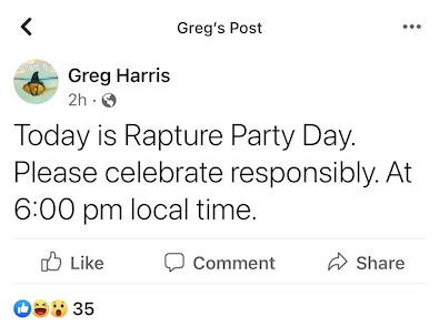 I was raised Baptist and I don’t remember anyone ever mentioning Rapture Parties. I thought we weren’t supposed to know when it was going to happen. How do you plan a party for that?