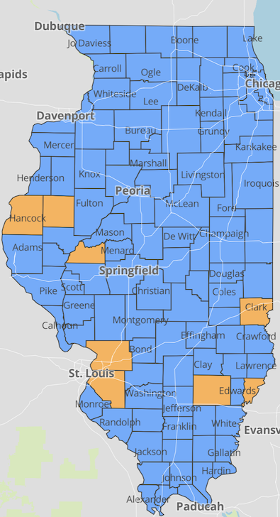 5 of the 8 counties in orange border on another state with looser restrictions than Illinois. Must just be a coincidence.