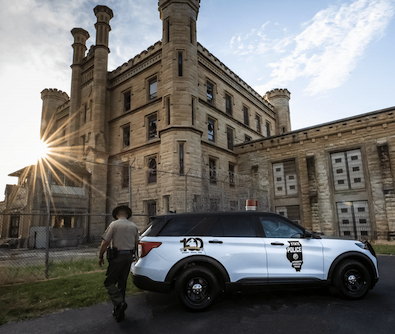 A buddy of mine at ISP says this is a “home-grown Illinois Ford Interceptor.” It’s apparently a retro design for the ISP’s 100th anniversary. The cruiser is pictured above, he said, “Outside the Blues Brothers movie set.” In other words, Joliet’s old prison.