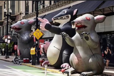 Inflatable rat points out the masonry crumbling across the street, done by non-union bricklayers