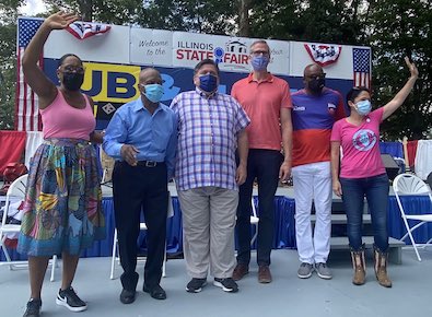 The 6 people at the Illinois State Fair wearing masks gather for a commemorative group picture.