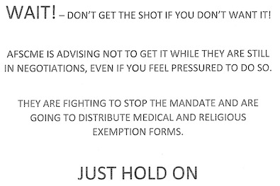 The vax/mandatory test combo looks like it could be a solution. Good on AFSCME for supporting it. Government workers have a responsibility to promote health and life and should gladly embrace the responsibility of regular testing or vaccination.